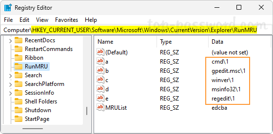 HKEY_CURRENT_USER\SOFTWARE\Microsoft\Windows\CurrentVersion\Explorer\RunMRU。在右側窗格中,您將看到您在“運行”對話框中輸入的命令的完整列表。