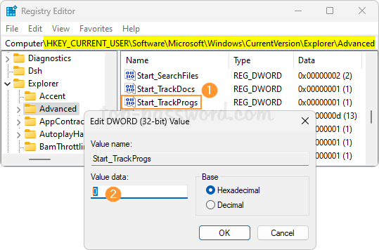 HKEY_CURRENT_USER\SOFTWARE\Microsoft\Windows\CurrentVersion\Explorer\Advanced。雙擊 DWORD開始_TrackProgs並將其值數據從 1 更改為 0。