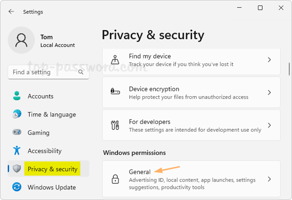 - 同時按下 WIN + I 鍵啟動“設置”應用程序。選擇隱私與安全,然後單擊一般的在“Windows 權限”部分下。