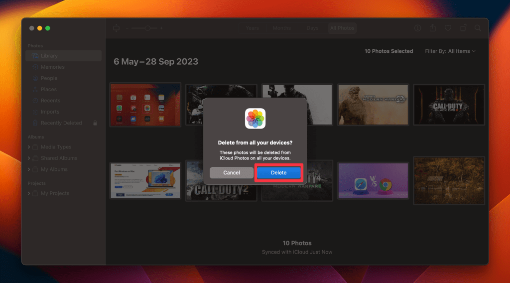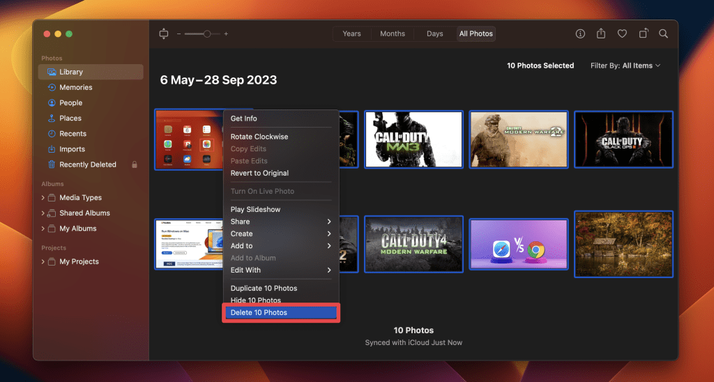 - 將出現一個上下文菜單。選擇刪除 X 張照片從選項中。