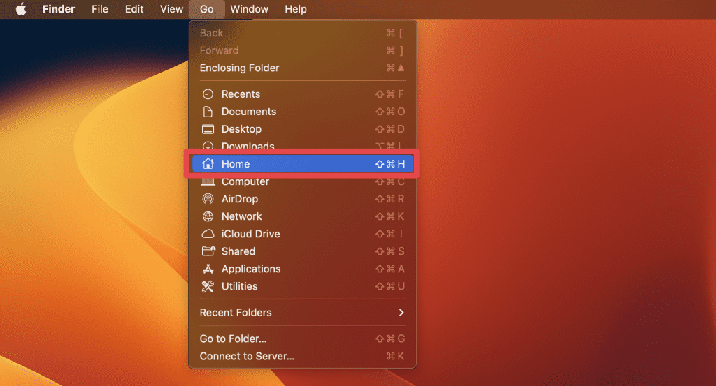 - 在頂部的 Finder 菜單欄中,單擊去,然後選擇家。這將帶您進入用戶的主目錄。