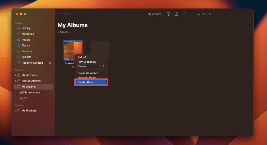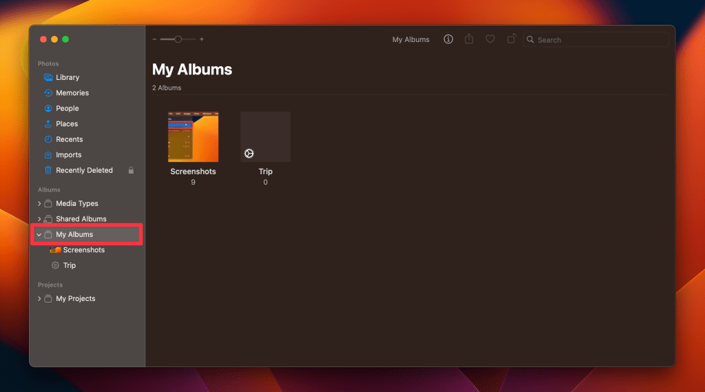 照片應用程序將您的圖像組織到相冊中,可以從左側邊欄訪問。您可以根據需要修改或刪除其中任何相冊。方法如下: