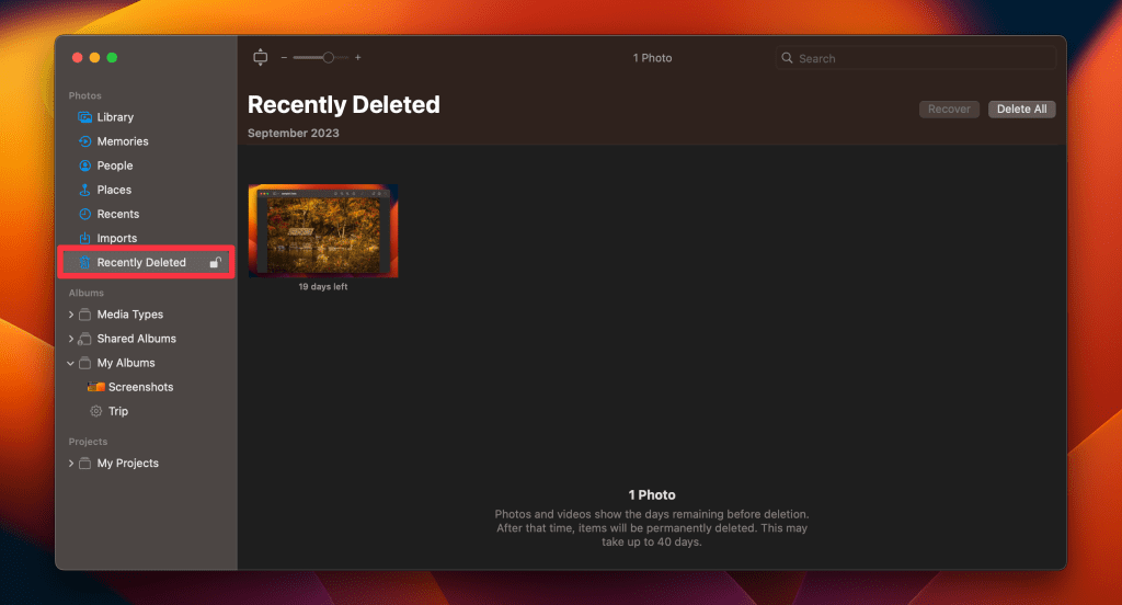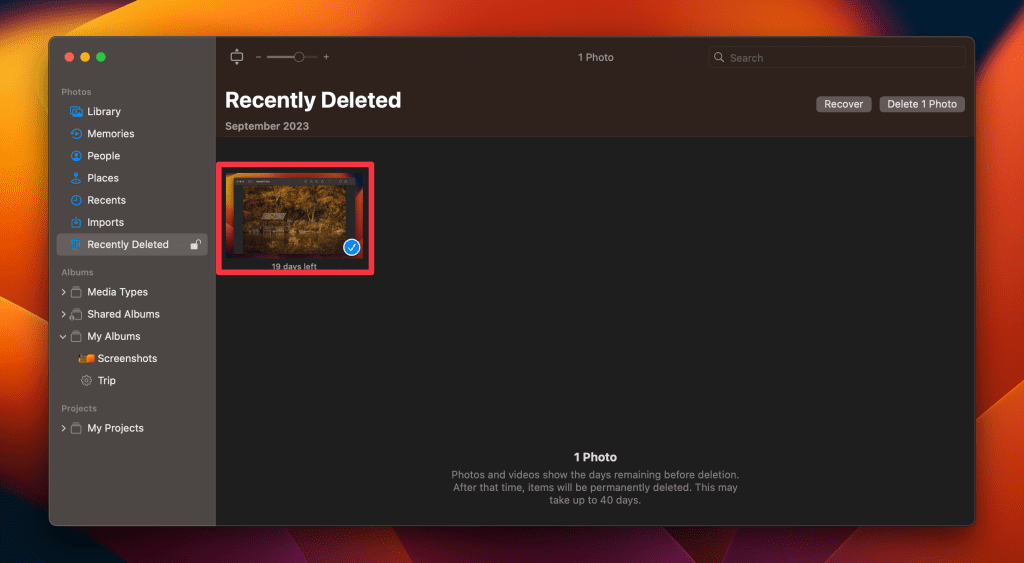 在 Mac 上,打開“照片”應用程序並導航到“最近刪除”相冊。在這裡,您會找到過去 30 天內刪除的照片。選擇要恢復的圖像並單擊恢復。他們將被恢復到原來的位置。請立即採取行動,因為它們會在 30 天后自動刪除。