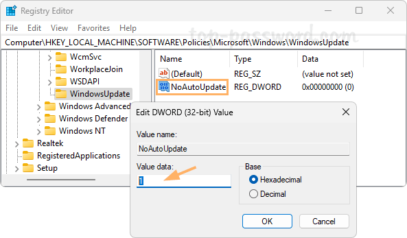- 命名新DWORDnoautoupdate,然後雙擊它以將其價值數據從0更改為1。這將完全禁用自動Windows更新。