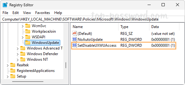 - 如果您想禁用“檢查更新”按鈕,也創建一個新的dword,稱為setDisableUxWuAccess在同一註冊表位置,並將其值數據設置為1。