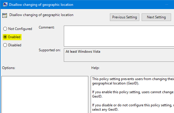 - 要在 Windows 10 中禁用更改位置,請選擇啟用然後單擊好的。