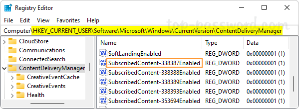 HKEY_CURRENT_USER\Software\Microsoft\Windows\CurrentVersion\ContentDeliveryManager。雙擊 DWORD訂閱內容-338387已啟用在右側。