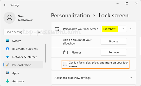 - 取消選中“在鎖定屏幕上獲取有趣的事實、提示、技巧等”選項。您將不再在鎖定屏幕上看到有趣的事實、提示和技巧。