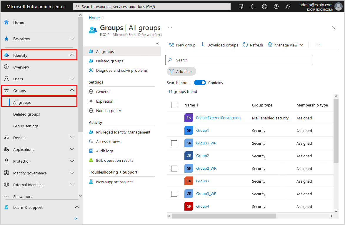 登錄到微軟 Entra 管理中心。點擊身份 > 組 > 所有組。