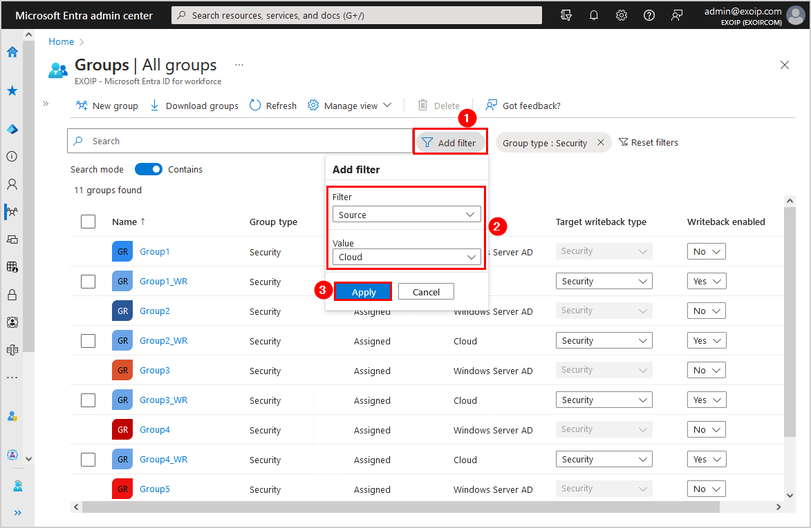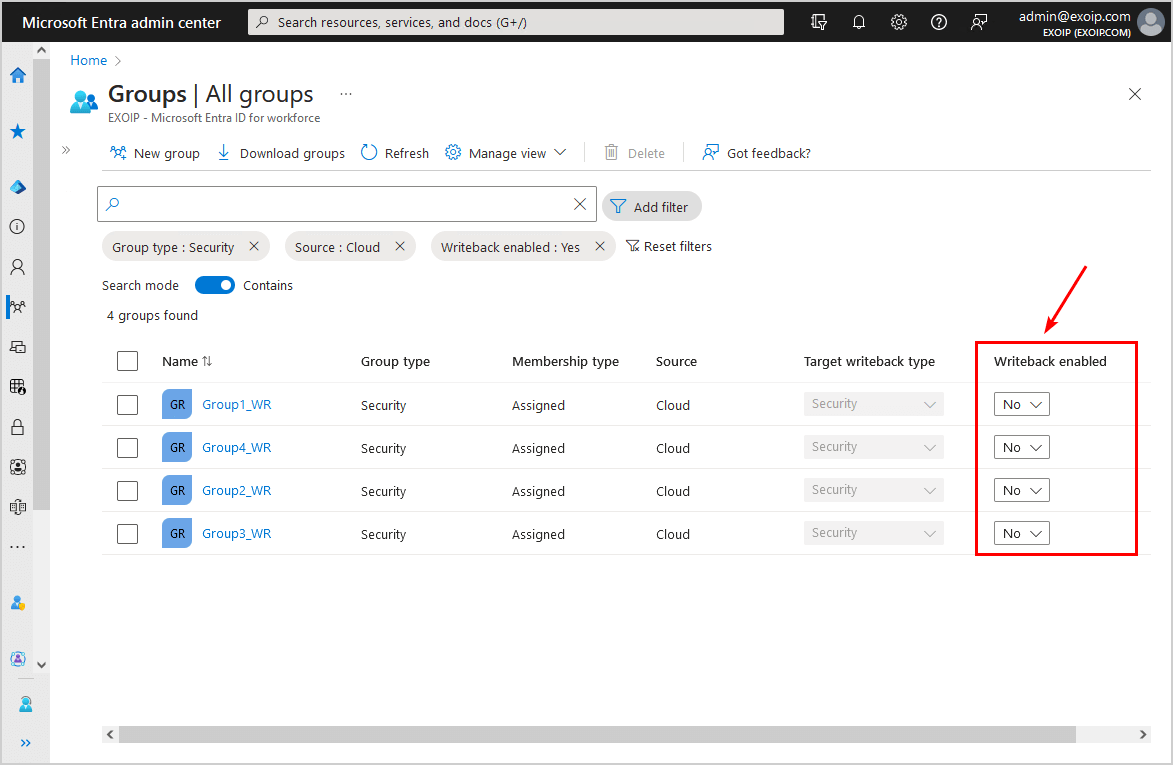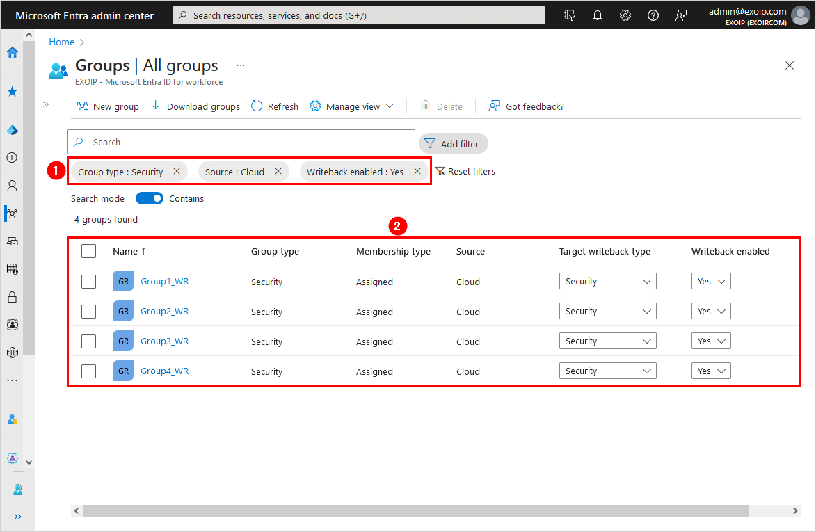 要獲取哪些安全組啟用了組寫回 v2 的列表視圖,請在 Microsoft Entra ID 中篩選它們。