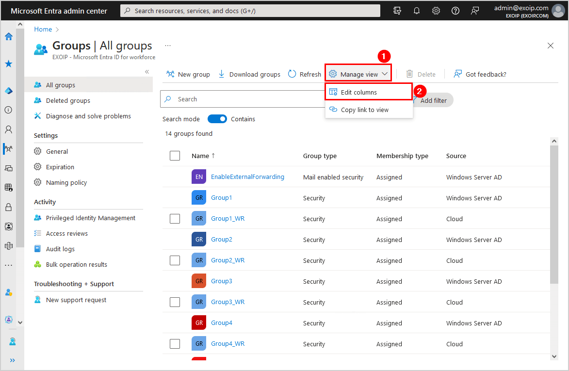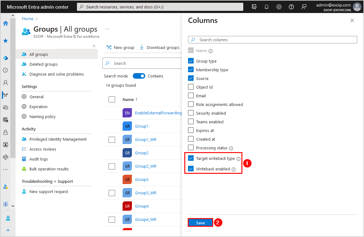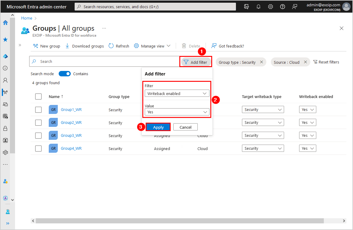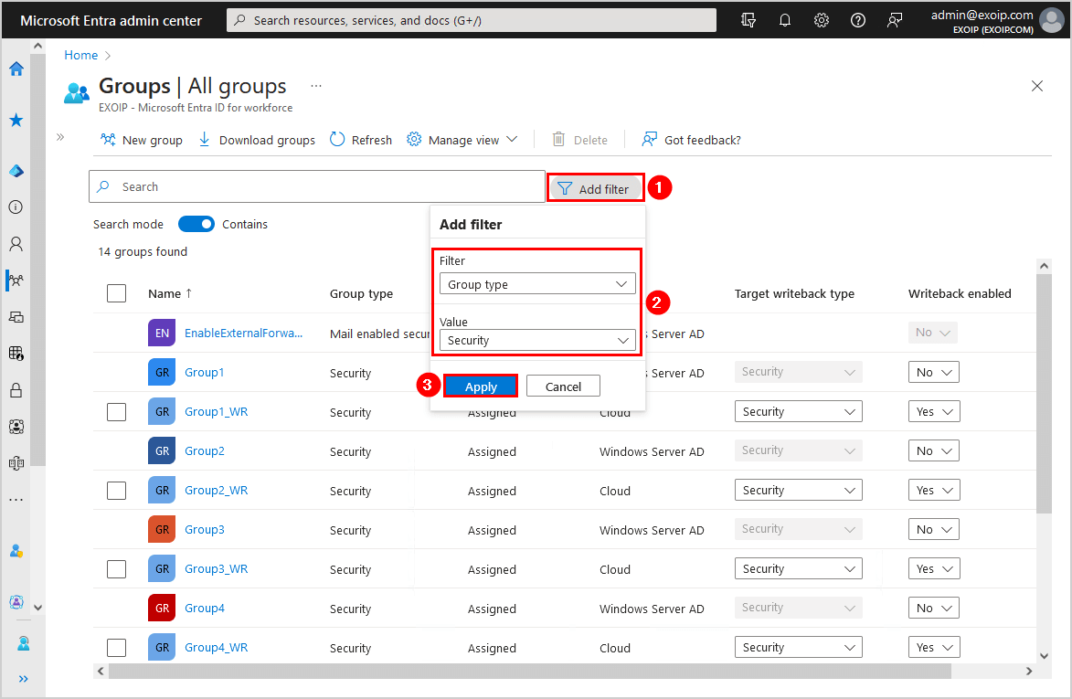 要獲取哪些安全組啟用了組寫回 v2 的列表視圖,請在 Microsoft Entra ID 中篩選它們。