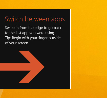 今天,當我嘗試在 Windows 8.1 上設置圖片密碼時,屏幕左邊框上出現一個黑色大矩形。矩形內部有一個橙色的大箭頭和文字“在應用程序之間切換。從邊緣向內滑動即可返回到您最近使用的最後一個應用程序。”煩人的是它覆蓋了屏幕的一部分,我無法擺脫它。