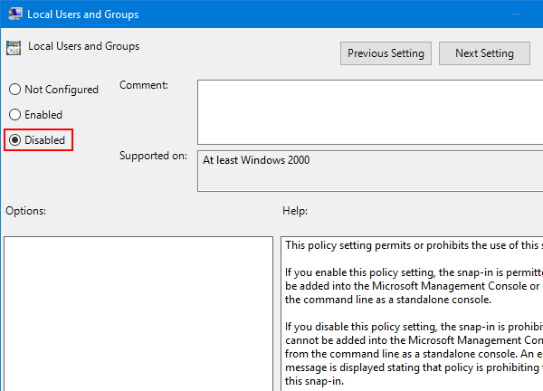 User Configuration -> Administrative Templates -> Windows Components -> Microsoft Management Console -> Restricted/Permitted snap-ins - 現在,在右側窗口中,雙擊“本地用戶和組”設置進行修改。