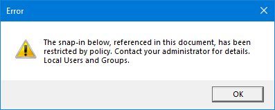 - 該政策設置將立即生效。您會發現本地用戶和組未顯示在計算機管理中。如果您嘗試使用 lusrmgr.msc 命令打開本地用戶和組,您將收到以下錯誤消息:“本文檔中引用的下面的管理單元已受到策略限制。有關詳細信息,請與您的管理員聯繫”。