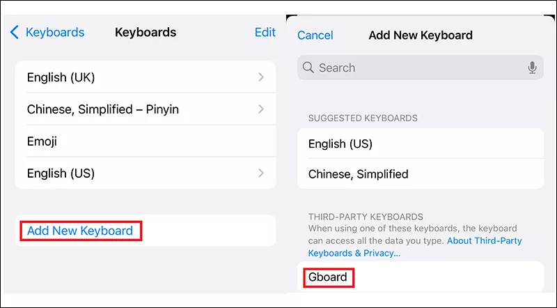 步驟一:下載G板從 App Store,然後轉到設定>一般的>鍵盤>鍵盤。點擊添加新鍵盤, 選擇G板。