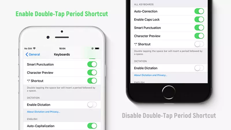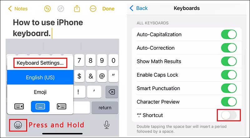 步驟3:向下滾動並找到“。”捷徑設置,將開關切換至 ON 位置。現在,您可以通過雙擊空格鍵使用鍵盤輸入句點符號。