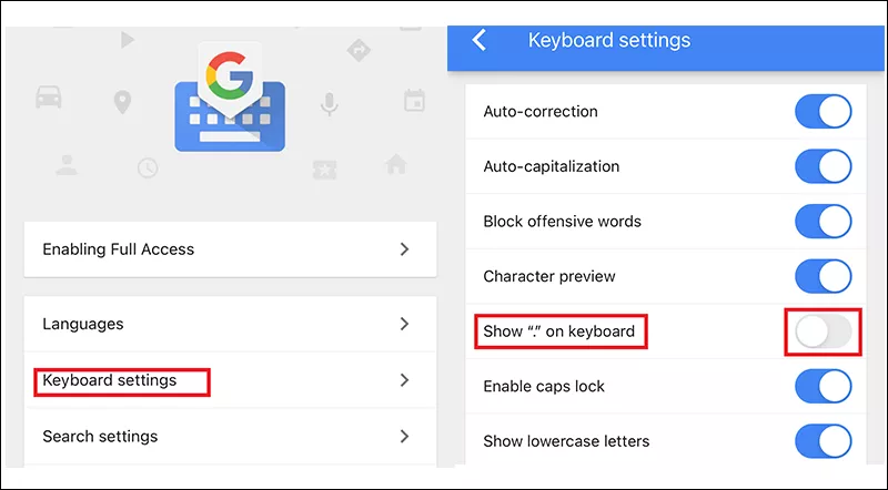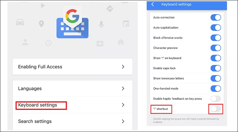 步驟: 打開 Gboard。點擊鍵盤設置, 打開或關閉“。”捷徑。