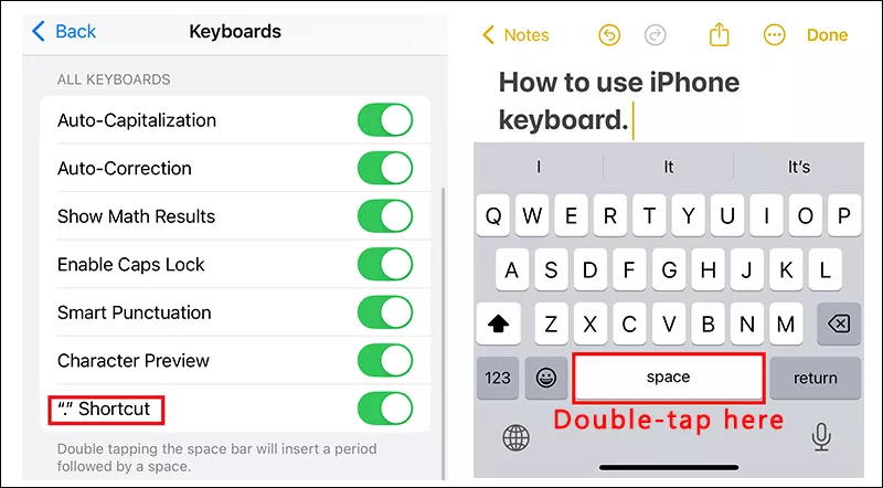 當您在鍵入時雙擊空格鍵時,句點快捷方式會自動插入句點和空格。它旨在通過減少在句子末尾手動按句號鍵的需要來加快打字速度。