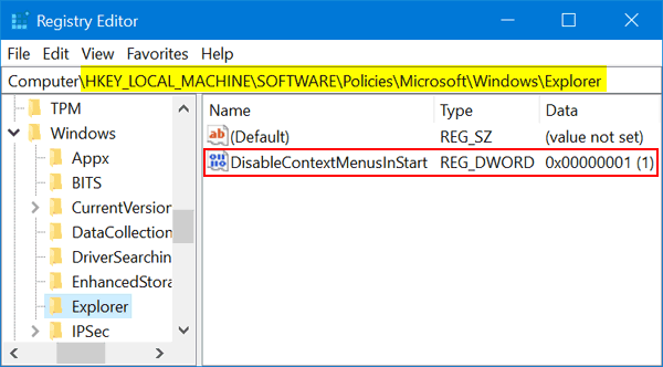 HKEY_LOCAL_MACHINE\SOFTWARE\Policies\Microsoft\Windows\Explorer如果您沒有“探險家” 子項,然後創建它。 - 創建新的 32 位 DWORD 值禁用上下文菜單開始,並將其設置為 1 以禁用“開始”菜單中的上下文菜單。