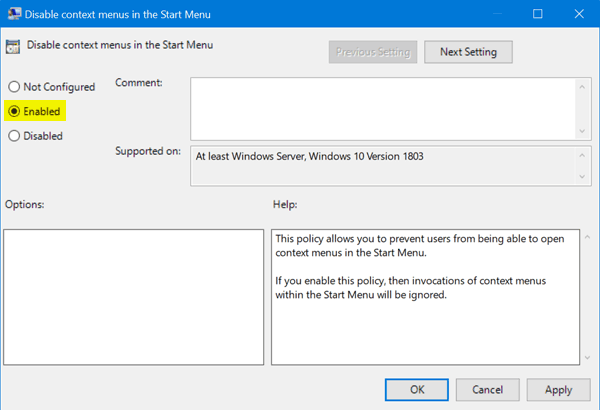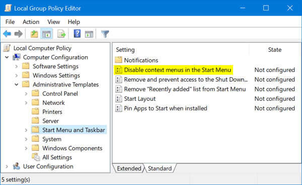 - 在本地組策略編輯器的左窗格中,導航到電腦配置->管理模板->開始菜單和任務欄。按兩下"禁用“開始”菜單中的上下文菜單” 右側窗格中的策略。