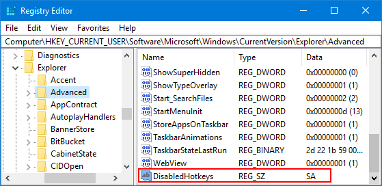 等等。 - 重新啟動計算機,您指定的熱鍵將被禁用。如果您想恢復原來的熱鍵功能,只需刪除禁用熱鍵值,你就完成了。