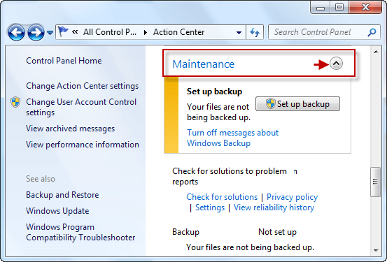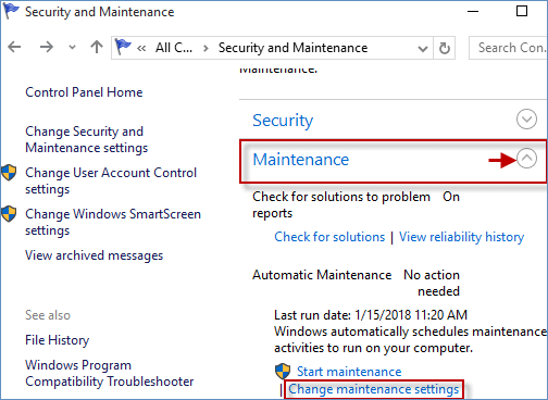 第 2 步:在安全與維護對話框,展開維護然後單擊更改維護設置關聯。