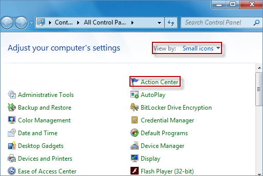 第二步:在控制面板中,設置查看方式進入小圖標。導航至並選擇行動中心在新窗口中。
