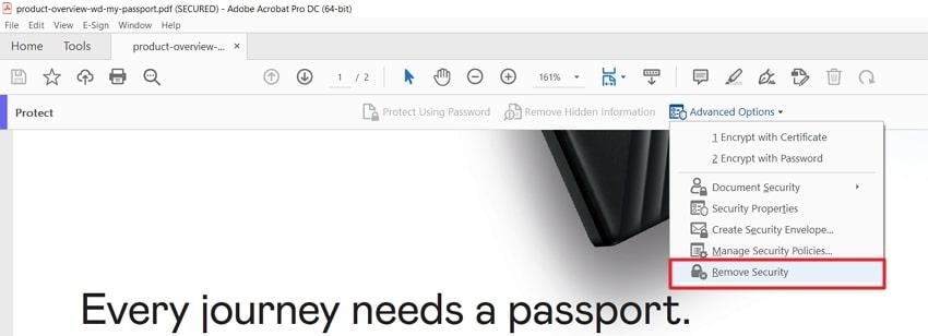 步驟1:在 Adobe Acrobat 中打開只讀 PDF 文檔,然後單擊右側邊欄中的“保護”。現在,點擊“高級選項”並選擇“刪除安全性”。現在,輸入密碼並按“確定”。