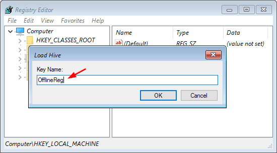 - 輸入您喜歡的鍵名稱(例如“OfflineReg“)並單擊好的。該名稱將用於在樹中創建一個新節點,以便可以瀏覽離線註冊表。