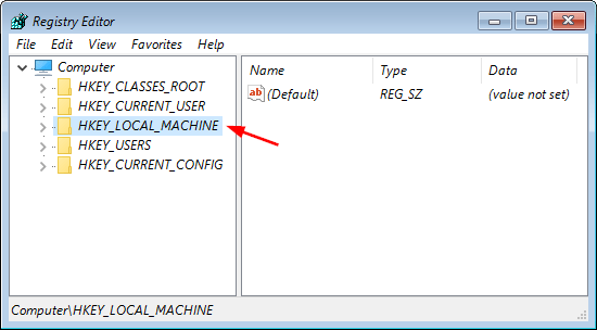 - 在註冊表編輯器的左窗格中,突出顯示HKEY_LOCAL_MACHINE配置單元(或 HKEY_USERS)。