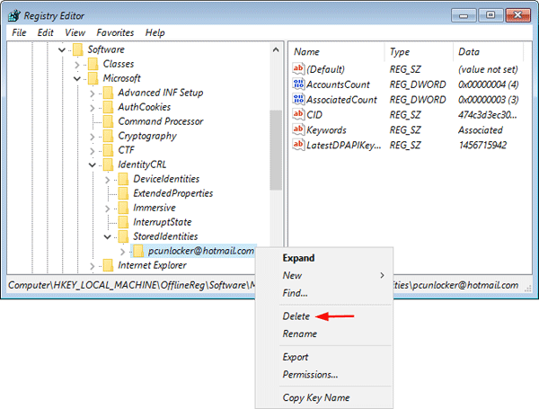 - 展開新鍵,瀏覽到所需的鍵或值進行編輯。在我的示例中,我瀏覽到 OfflineReg\Software\Microsoft\IdentityCRL\StoredIdentities 並刪除其子項。