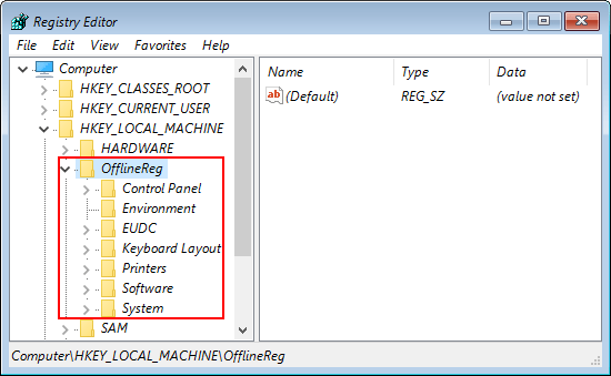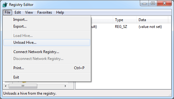 - 完成修改後,突出顯示您之前創建的鍵(例如“OfflineReg”)。單擊文件菜單並選擇卸載配置單元。
