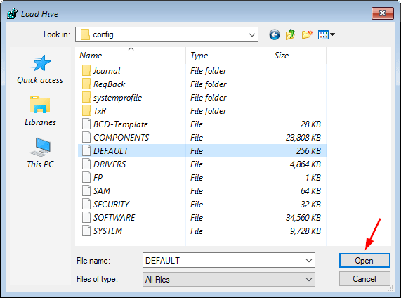 - 瀏覽到您的 Windows 分區並選擇您想要加載的註冊表配置單元。在我的示例中,註冊表配置單元位於目錄 D:\Windows\System32\Config 中。