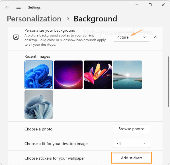 - 開始之前,請打開“設置”應用程序並轉到:個性化->背景,確保“個性化您的背景” 下拉列表設置為“圖片”。