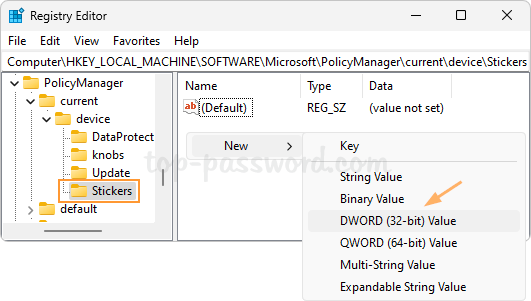 - 將新密鑰命名為貼紙,然後選擇它。在右側窗格中,右鍵單擊空白區域並選擇新的->DWORD(32 位)值。