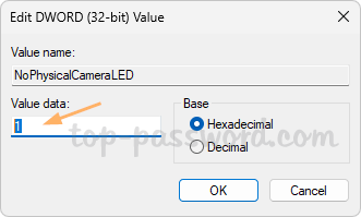 - 將其值數據從 0 更改為 1 以啟用相機隱私通知。關閉註冊表編輯器並重新啟動系統以應用更改。