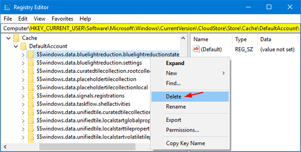 HKEY_CURRENT_USER\Software\Microsoft\Windows\CurrentVersion\CloudStore\Store\Cache\DefaultAccount - 展開默認帳戶鍵,然後右鍵單擊並刪除以下兩個子鍵: