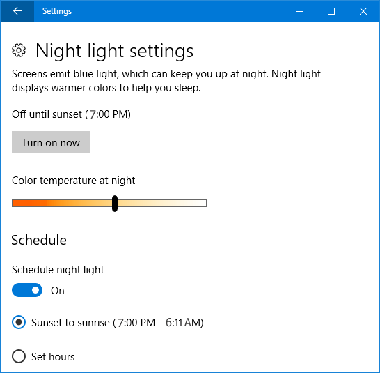 在那裡,您可以通過拖動滑塊來調整色溫,並將夜燈設置為在太陽落山時啟動,並在日出時自動禁用。完成後,您可以單擊“立即開啟”按鈕立即啟用夜燈功能。