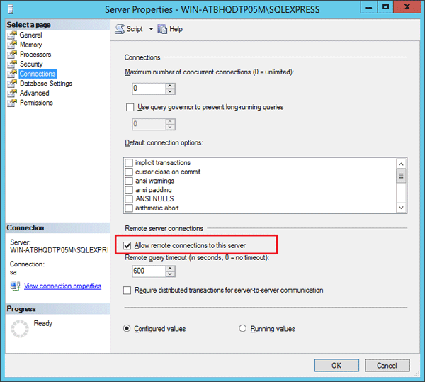 選擇連接左側窗格中的頁面並確保複選框允許遠程連接到此服務器被選中。完成此操作後,退出 SQL Server Management Studio。