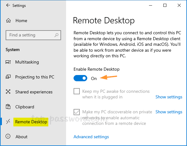 - 選擇遠端桌面選項卡。在右側窗格中,切換“啟用遠程桌面”選項打開。