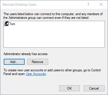 - 默認情況下,管理員組中的所有用戶帳戶都可以遠程訪問這台電腦。如果您想向非管理用戶授予遠程訪問權限,請單擊“遠程桌面用戶”選項。當出現“遠程桌面用戶”對話框時,您可以單擊添加按鈕添加其他用戶帳戶。