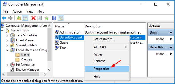 - 擴張系統工具->本地用戶和組->用戶在左側。在右側,右鍵單擊 DefaultAccount 並選擇特性。