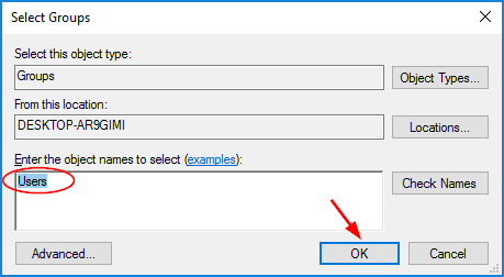 - 在“選擇組”窗口中,輸入用戶在對象名稱框中,然後單擊好的。