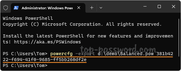 d:\demo\Balanced.pow。這Your_GUID需要替換為您要導出的電源計劃的實際 GUID。powercfg -export d:\demo\Balanced.pow Your_GUID