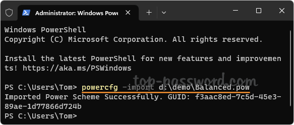 d:\demo\Balanced.pow以及保存 .pow 文件的位置。powercfg -import d:\demo\Balanced.pow