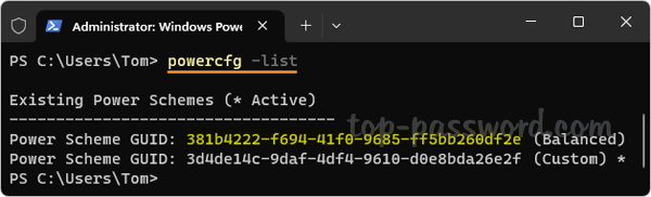 powercfg -list命令顯示系統中可用的所有電源計劃。每個電源計劃都有自己唯一的 GUID。