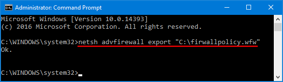 netsh advfirewall export "C:\firwallpolicy.wfw"