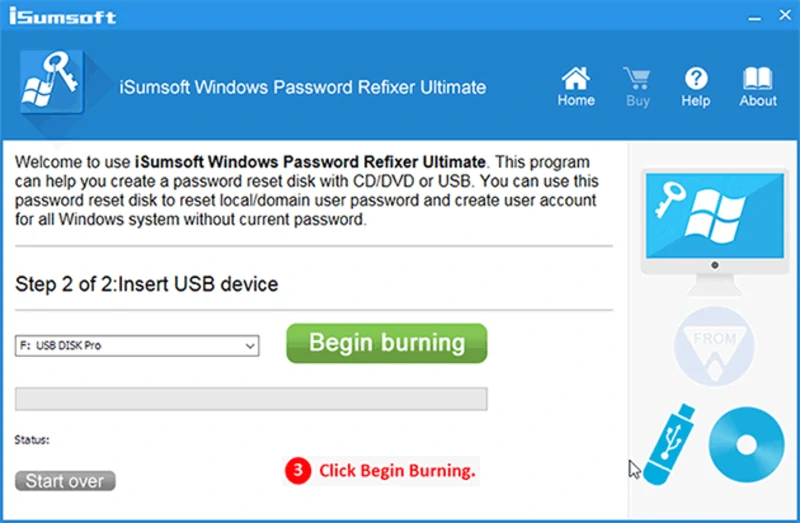 步驟2插入空白 USB 閃存驅動器,然後將 Windows 密碼修復程序刻錄到 USB 閃存驅動器以創建密碼重置盤。
