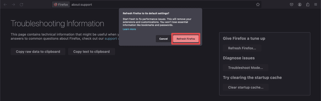 - 當您單擊“刷新Firefox”時,彈出窗口將出現在頁面頂部。點擊刷新Firefox再次。