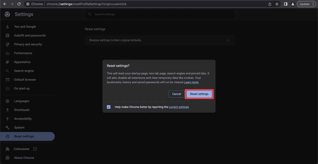 - 將出現一個彈出窗口。點擊重置設置,它將將您的Chrome設置還原為默認設置。